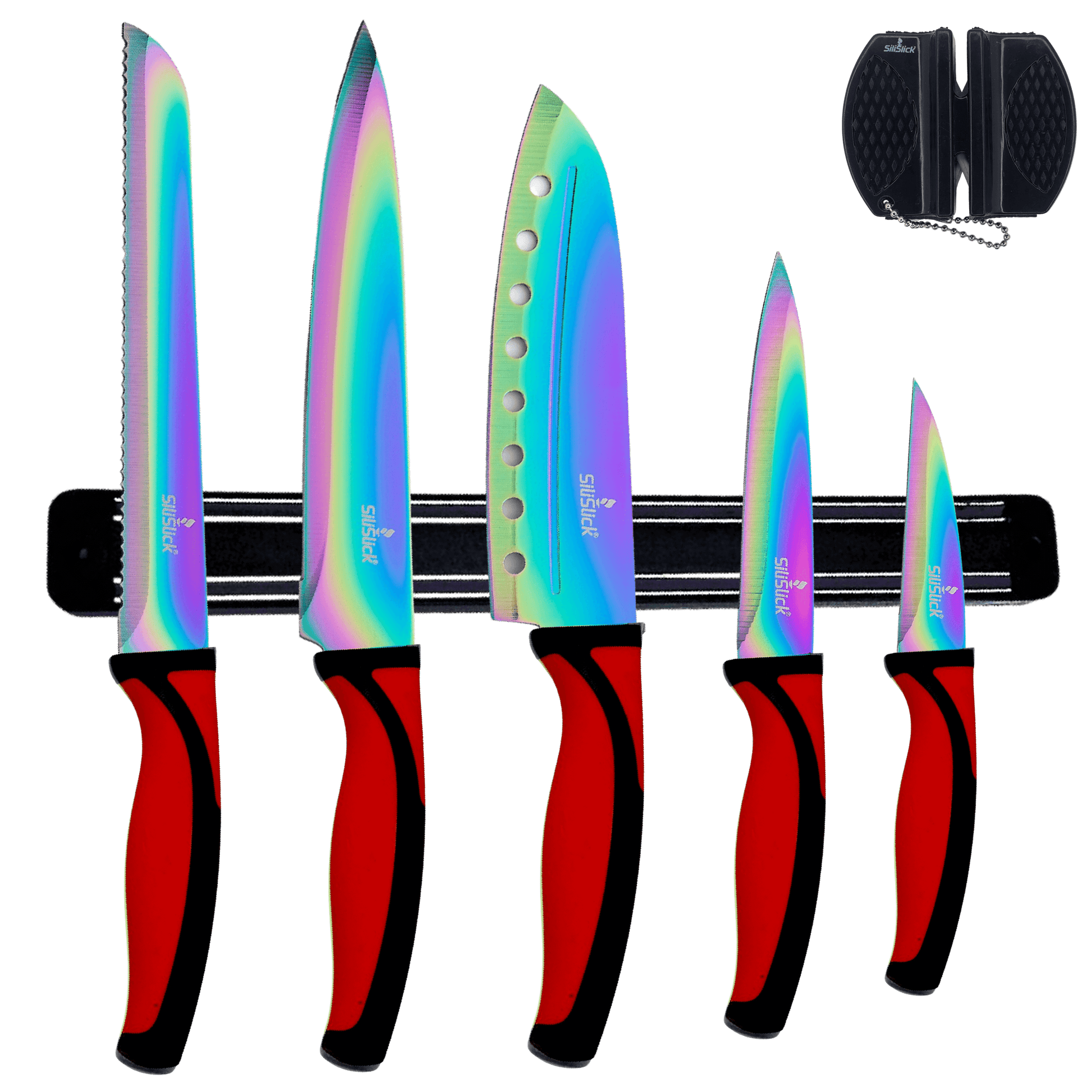 ✅ WHAT’S INSIDE : Upgrade your kitchen with our professional grade SiliSlick starter knife set. This kitchen knife set kit includes 5 essential knives: an 8" Chef Knife for all-purpose slicing, an 8" Bread Knife for perfectly even cuts, a 7" Santoku Knife for precision dicing, a 5" Utility Knife for medium-sized tasks, and a 3.5" Paring Knife for intricate work. Each blade is honed to a sharp, precision edge and coated in non-stick titanium for easy slicing and clean cuts. The set also includes a magnetic knife holder for safe storage and easy access to your knives, as well as a sharpener to keep your blades in top condition. Perfect for home cooks and professional chefs alike.